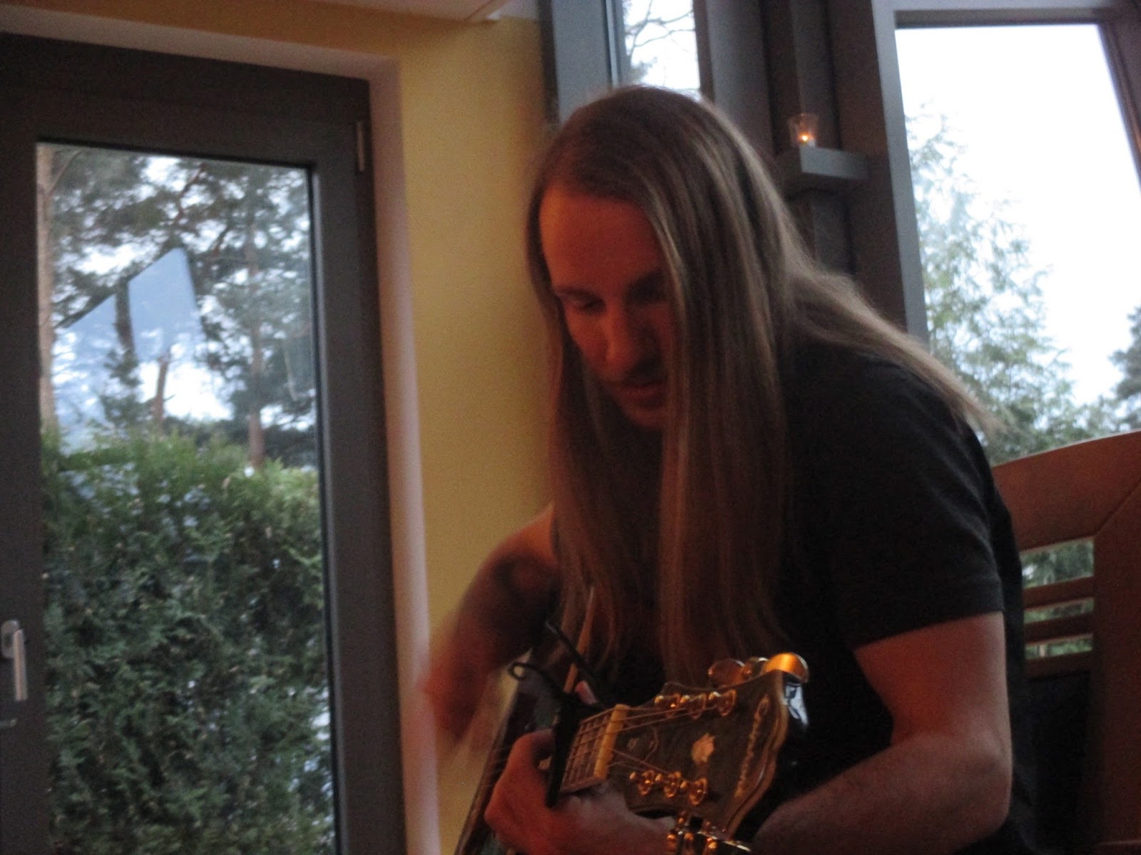 Gus benutzt auf den größeren Bühnen Loops und natürlich Verstärkung für Stimme und Gitarre. Aber über der ersten Tasse Tee hatten wir uns schon so halb und halb darauf verständigt, dass es in der intimen Atmospähre des Wohnzimmers ruhig ganz akustisch sein dürfte. Und das Rezept ging dann prima auf. Es hätten allerdings gern noch ein paar mehr Zuhörer sein dürfen. Auch meine lieben Nachbarn, bei denen ich kurz vor knapp noch einmal Bescheid sagte, ließen sich leider nicht überreden.